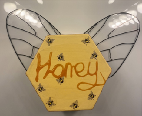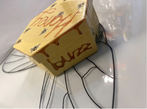 For my brand packaging, I decided to do a hexagon shape to represent a part of a beehive. The stickers that we can see on top of the box are printed on Grafiprint from our University’s DDH print studio. The wings are printed on acetate. The whole reason behind the wings is to represent a bee’s wings for the packaging and to make it stand out more from a regular honey jar packaging or gift set. The words we can see, such as ‘Honey’ and ‘buzz’ are written with actual honey then digitalised in Photoshop to make some of the letters more readable, this way I had my own type created with the product that I was creating a brand for.