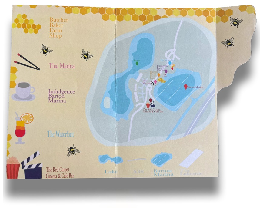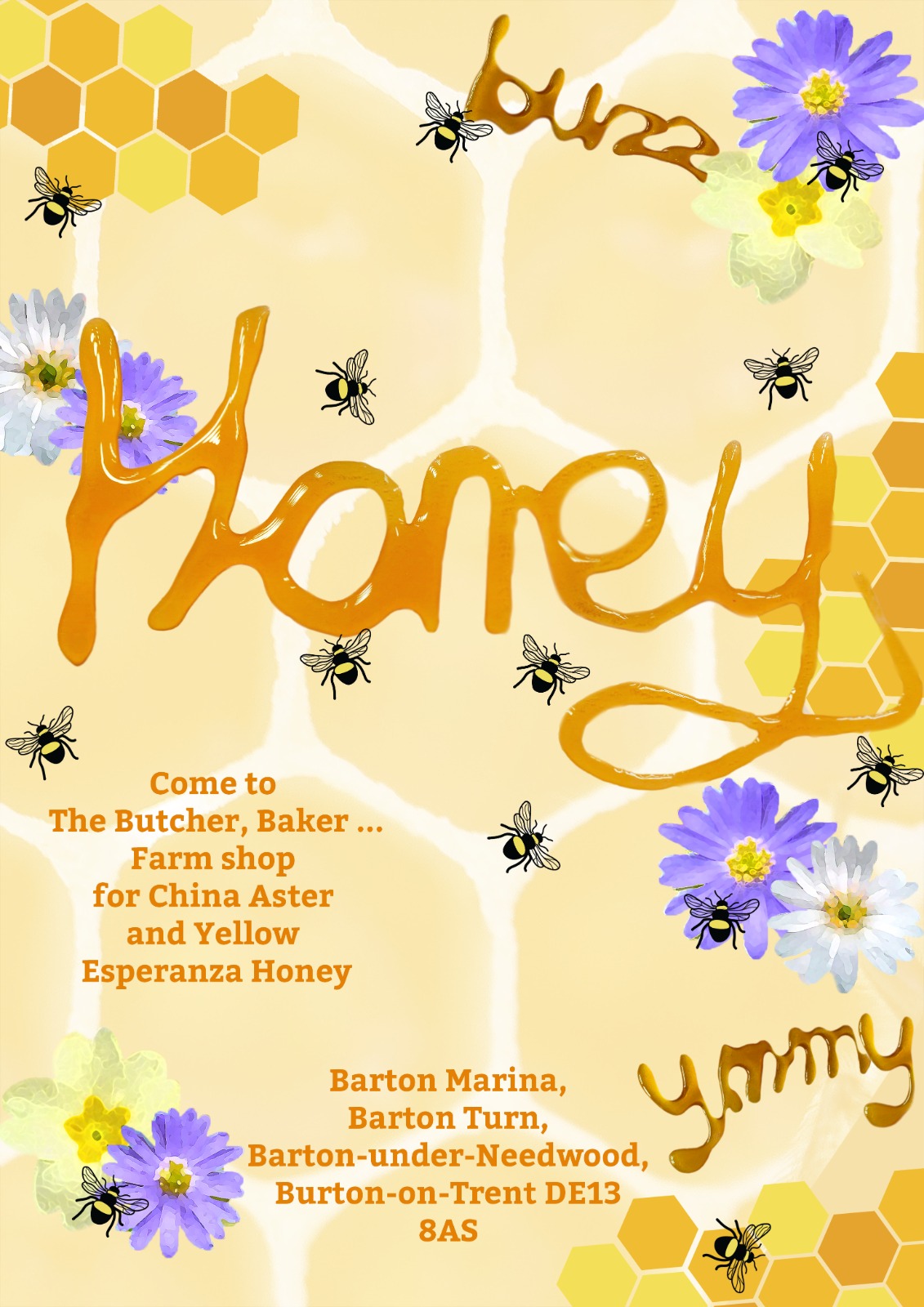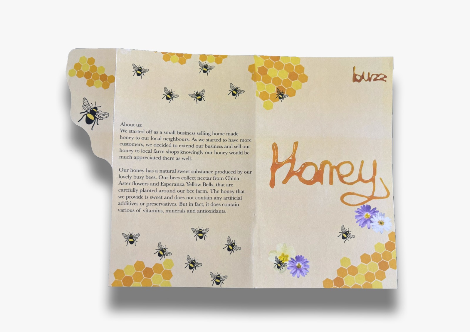 For my brand packaging, I decided to do a hexagon shape to represent a part of a beehive. The stickers that we can see on top of the box are printed on Grafiprint from our University’s DDH print studio. The wings are printed on acetate. The whole reason behind the wings is to represent a bee’s wings for the packaging and to make it stand out more from a regular honey jar packaging or gift set. The words we can see, such as ‘Honey’ and ‘buzz’ are written with actual honey then digitalised in Photoshop to make some of the letters more readable, this way I had my own type created with the product that I was creating a brand for.